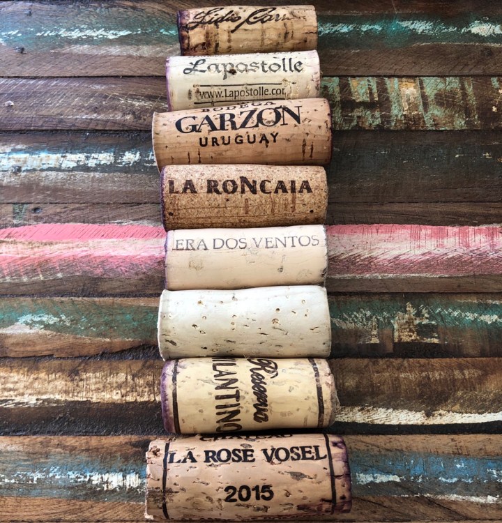 Degustamos 3 vinhos brasileiros, 2 franceses, 1 italiano, 1 uruguaio e 1 chileno.